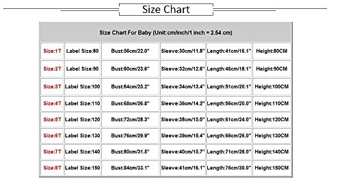 Maattabel voor kinderen (eenheid: cm/inch/1 inch = 2,54 cm).