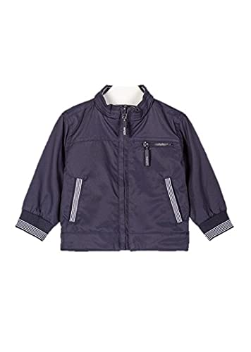Donkerblauwe omkeerbare jas voor baby’s. Jas met zijzakken aan de voorkant. Met geribbelde stof aan de polsen. Eenzijdig effen met paspelzak met ritssluiting op de borst en dezelfde hoogte naden. Aan de andere kant met geribbelde stof aan de zoom en in de kraag in marineblauw en wit gestreept.