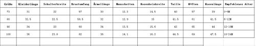 73 Bovenlengte: 31 Borst: 22 Taille: 40 Heup: 57 Broeklengte: 39 Leeftijd: 0-6 maanden